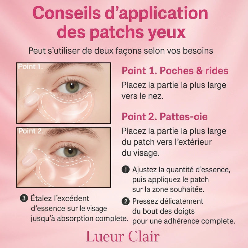 Les patchs Lueur Clair s’appliquent là où vous en avez le plus besoin : rides du front, rides du lion, pattes-d’oie, cernes, poches, sillon nasogénien et rides du cou. Une solution simple pour hydrater, lisser et défatiguer la peau en quelques minutes.
